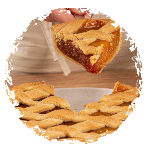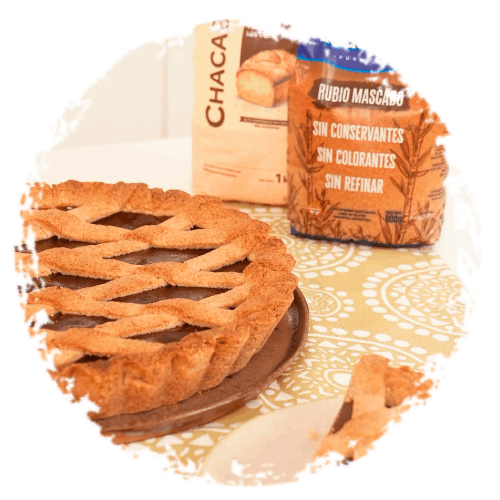 Para el relleno, pisar el dulce de membrillo y el de batata, por separado, hasta que no tengan grumos. Colocar el dulce por encima de la masa y colocar por arriba las tiritas con la masa reservada y disponer sobre el membrillo y la batata formando un enrejado.